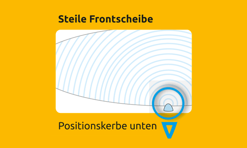 Bei Fahrzeugen mit einer steilen Frontscheide bringen Sie die Linse mit der glatten Fläche an die Scheibe und das Linsen-Auge mit der kleinen Kerbe nach unten in der von Ihnen gewünschten Position an.